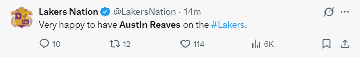 奥斯汀-里夫斯实在是太出色了,末节开场湖人还在落后,但在短短1分06秒的时间里里夫斯一人打出了8-0的攻势直接帮助湖人反超,湖人队记迈克-特鲁戴尔都觉得不可思议。